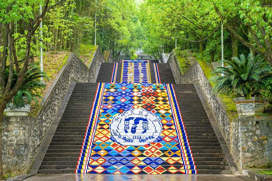 2022年5月23日,学校党委宣传部联合美术与设计学院师生,通过专业课程实践教学,对老图书馆前的百步阶梯进行美化。整个美化工程分六部分,第一、二层阶梯内容以校徽、校训为主创元素,辅以土家族西兰卡普装饰纹样,第三层阶梯内容为阳雀花图案,第四、六层阶梯是西兰卡普装饰纹样,第五层阶梯以土家双龙戏珠内容为主。美术与设计学院视觉传达专业65名学生,在指导老师的辅助下,参照设计图用丙烯颜料一笔一画地勾勒、上色,绘制出了色彩丰富、鲜艳夺目的“团结奋进阶梯”,打造了特色鲜明的校园文化景观。