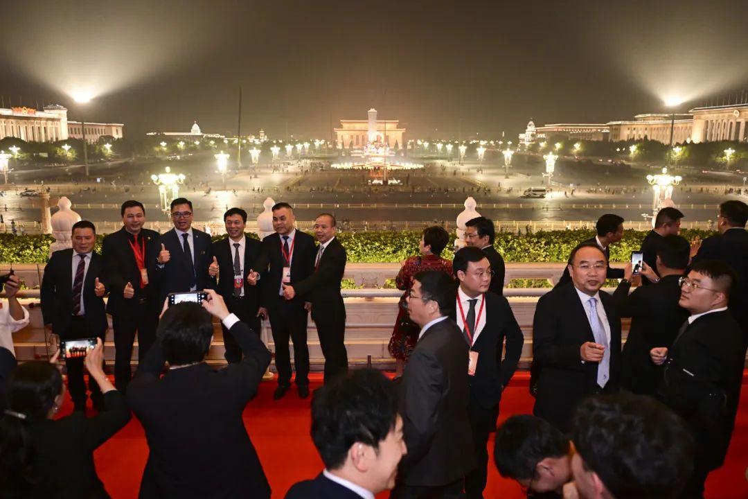夜幕降临,长安街华灯初上,天安门广场上的“祝福祖国”巨型花篮流光溢彩、璀璨夺目。侨界代表们登上天安门城楼参观,眺望北京天际线风景。