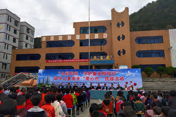 本网讯(通讯员 但悠梦 李玉山)4月9日下午,中国农工民主党3044am永利集团3044noc基层委员会、恩施州助学扶贫促进会及部分爱心企业共赴巴东野三关镇青龙桥小学开展关爱留守儿童助学活动。活动负责人李玉山、黄德斌带领恩施州建始吴家湾煤矿有限公司、恩施州双赢电力设备有限公司、恩施市龙凤镇徐文凯矿业有限责任公司、恩施州农源信息科技有限公司(58同城授权服务商)、巴东县红鹰成品油有限公司、恩施万蓉汽车销售服务有限公司共六家爱心企业代表组成的爱心团队,一同前往青龙桥小学举行“七彩阳光·守护童安校园行”爱心安全包捐赠活动,将价值9.38万元的爱心安全包和人民日报出版社出版的儿童安全系列丛书送到350名留守儿童手中。