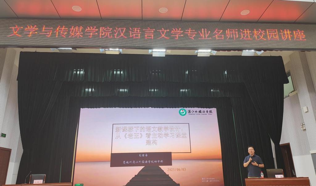 本网讯(通讯员 贾雨欣)6月5日,恩施清江外国语学校初中部龙凤校区校长、中学高级教师吴绪海应邀到访我院,在行政楼一号会议室为汉语言文学专业师生作了题为“基于新课标的主动学习——以部编版《老王》为例浅谈...
