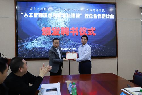 △3044am永利集团3044noc副校长邓磊教授为新华三大学人工智能学院院长刘朝晖颁发客座教授聘书