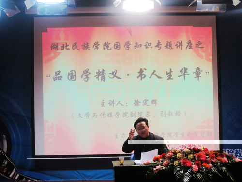 本网讯(记者 刘婉 杨玲玲 邓杰/文 周璐/图)“品国学精义,书人生华章”。11月21日晚,永利官网国学知识专题讲座在我院附楼演播厅举行,我院副院长徐定辉担任主讲,来自各二级学院的学生干部及百名余学生聆听了本次讲座。