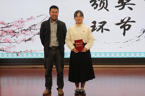 宋俊宏老师为李欣雨颁发一等奖(记者 李秀丽/摄)