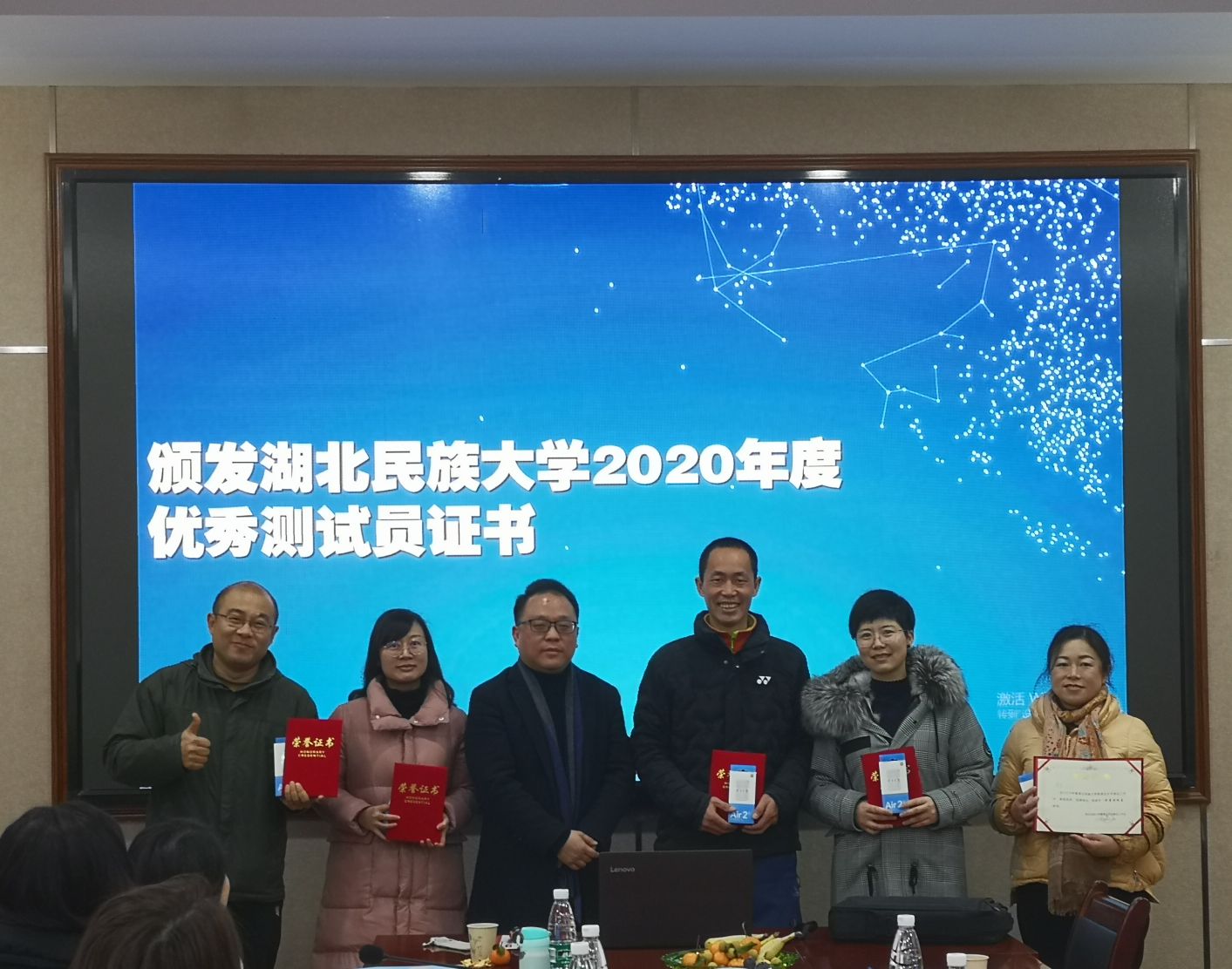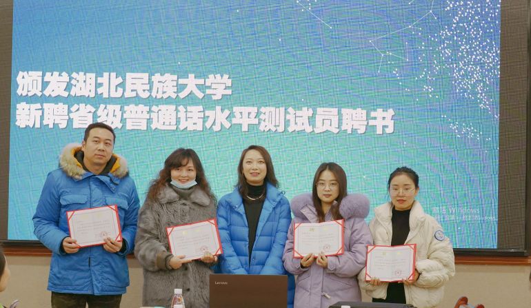 随后,郑艺副主任为2020年新聘的省级普通话水平测试员颁发了聘书,并希望他们能尽快的适应角色,早日成为测试员队伍的骨干力量。文学与传媒学院罗翔宇院长为3044am永利集团3044noc2020年优秀测试员颁发了证书,鼓励他们发挥良好的示范带头作用,为进一步提升永利官网良好的语言文字规范意识而努力。