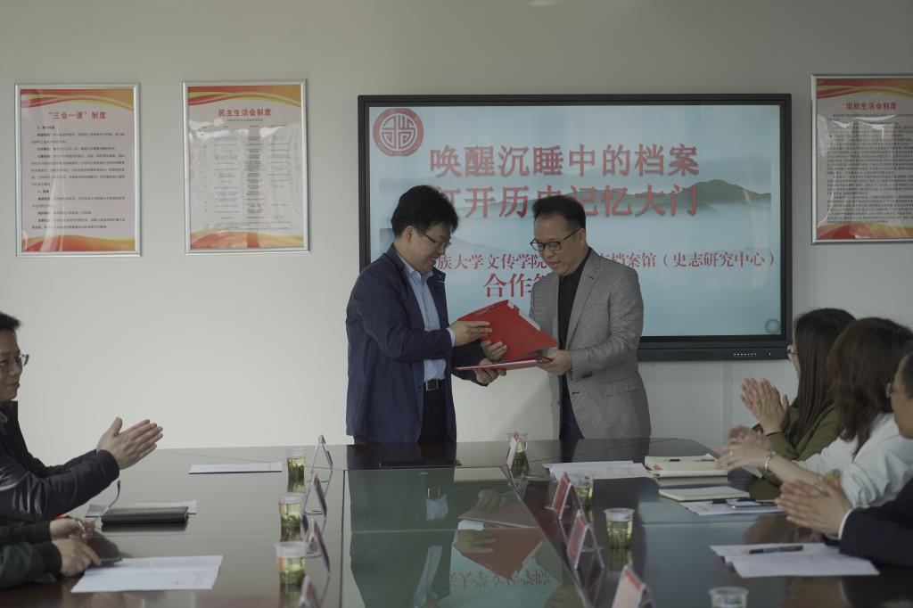 在恩施市档案馆会议室,罗翔宇院长与汪盛松馆长共同签署了双方共建基地的协同合作协议。在随后举行的双方合作座谈会上,校地双方的领导发表讲话,表示双方将在人才培养、科学研究、社会服务、文化传承四个方面开展合作,共建教育实习基地,为学校师生对文献史志的科研学习拓展资源,为人才培养提供新途径,推动文化传播工作及档案品牌文化建设,在双方的共建中实现共赢共享。