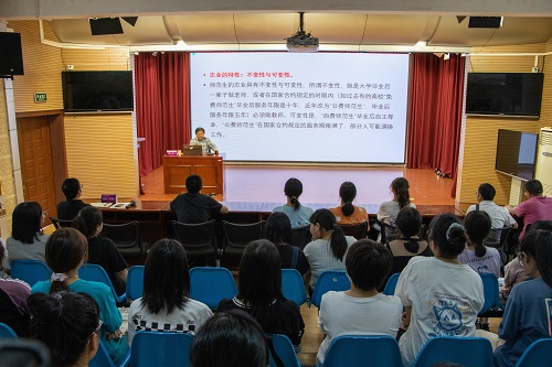 张三夕教授首先对研究生教育理念进行讲解,他认为,研究生教育是一种双向选择的近距离教育,对深入贯彻因材施教理念具有促进作用。研究生培养和本科生教育有明显差异,研究生培养是一种适合国家建设和社会需求的高层次人才培养,其教育成功离不开研究生与导师的良性互动,因此,导师应在热爱学生的同时严格要求学生,学生也应尊敬、配合导师。