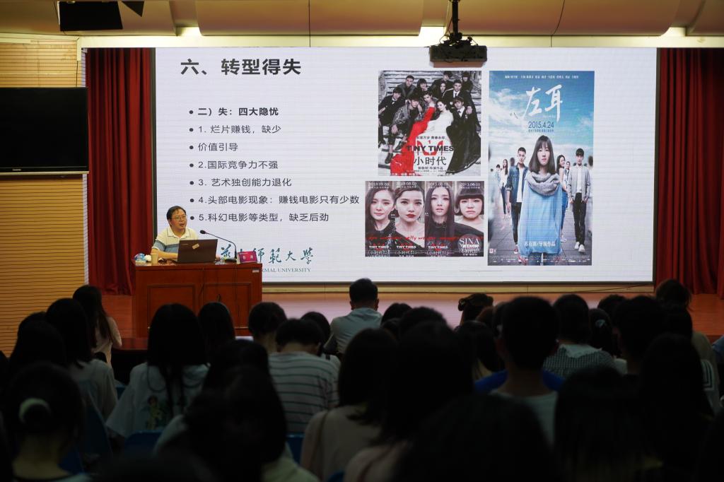 讲座中,彭涛教授围绕什么是主流电影、新世纪中国主流电影为什么要转型、新世界中国主流电影转型的路径选择、新世纪中国电影转型的审美选择、主流电影转型中值得主义的现象、转型得失与出路等六个方面与在座师生作了深入交流与探讨。彭涛教授聚焦“中国主流电影转型”这一问题,对新世纪中国电影工业进行了全面检视,深入分析了中国电影生产背后潜藏的市场逻辑与审美追求这两条伏线。他提出,新世纪中国主流电影的转型是必要的,发展新世纪的主流电影必须将官方文化与大众文化相结合,弘扬爱国主义和民族文化,抓住电影转型的机遇,迎接电影市场挑战。