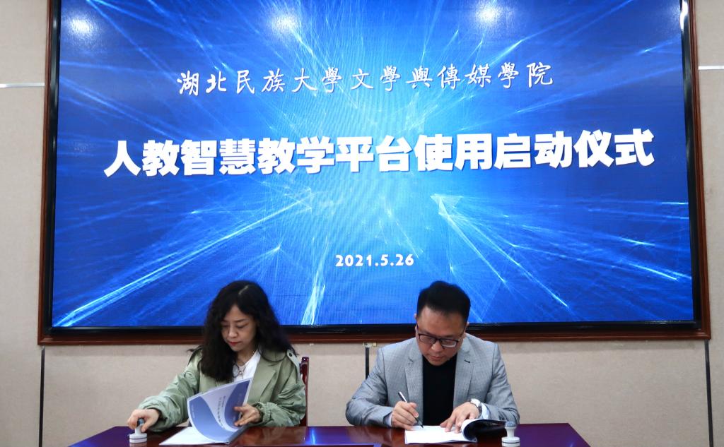 本网讯(记者 邢艺露)5月26日上午,人教智慧教学平台使用签约暨启动仪式在我院举行。文学与传媒学院院长罗翔宇、恩施州恒智教育科技公司总经理向宇、文学与传媒学院副院长何荣誉、校语委常务副主任郑艺、中文系教师代表及汉语言文学专业学生代表共计60余人参加仪式。