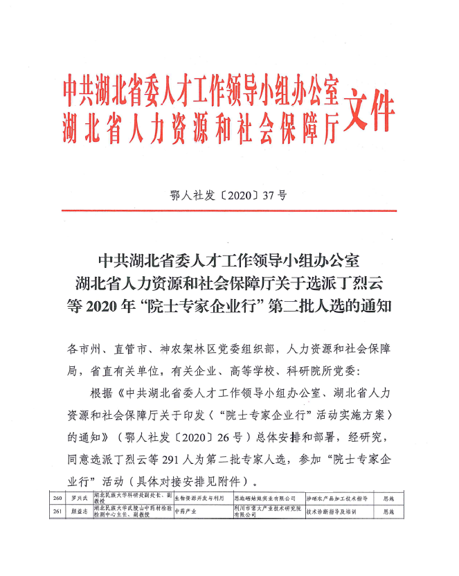 本网讯 (通讯员 聂晨笛) 近日,中共湖北省委人才工作领导小组办公室、湖北省人力资源和社会保障厅联合印发《关于选派丁烈云等2020年“院士专家企业行”第二批人选的通知》(鄂人社发〔2020〕37号),3044am永利集团3044noc武陵山中药材检验检测中心负责人颜益志入选“院士专家企业行”活动名录。