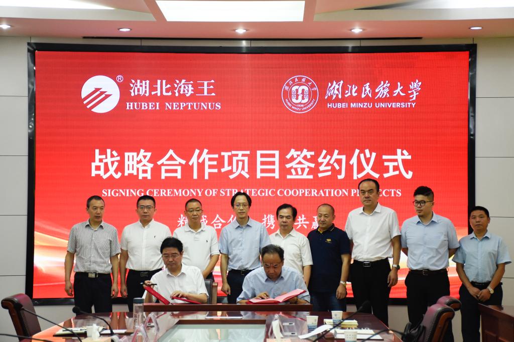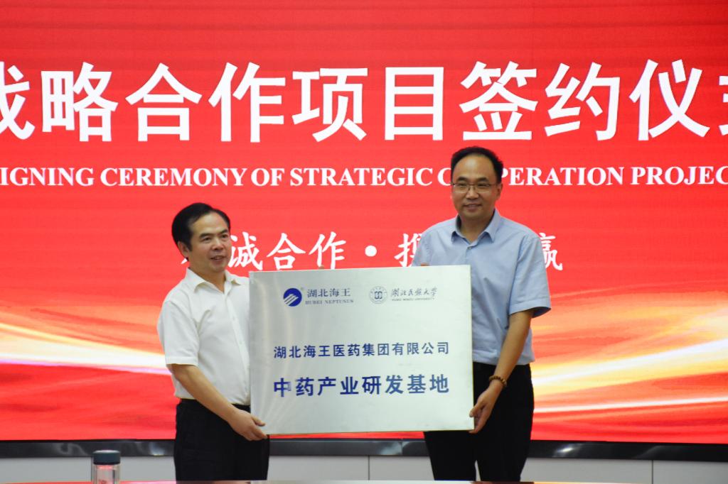 邓磊、张凡代表双方在战略合作协议书上签字。颜益志代表学校领受“湖北海王医药集团有限公司中医药产业研发基地”匾牌。