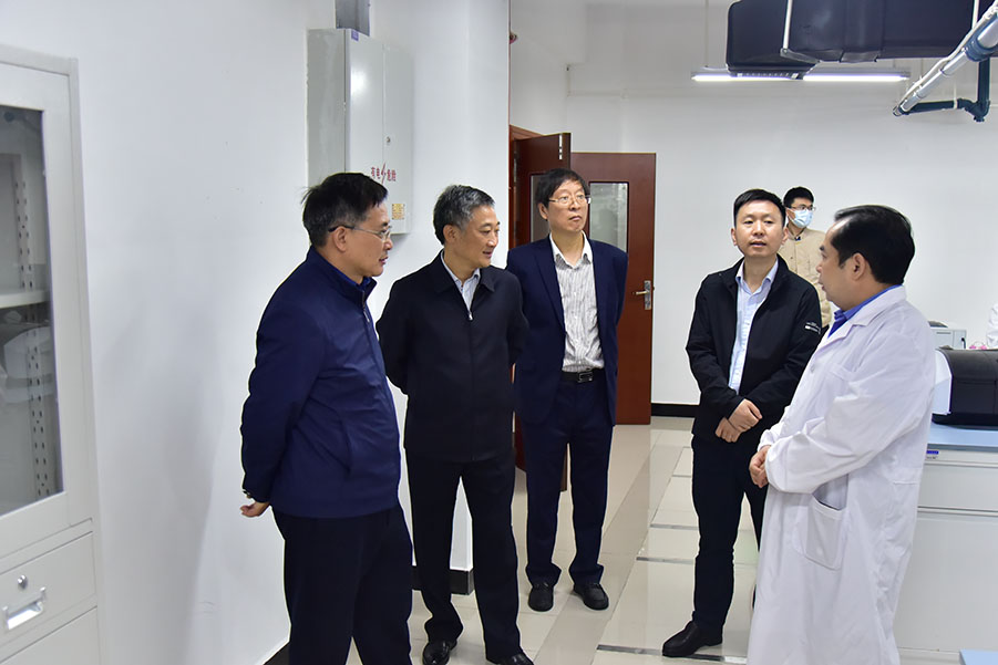 董长麒(左一)在顿祖义(左二)、祝建波(左三)的陪同下调研武陵山中药材检验检测中心