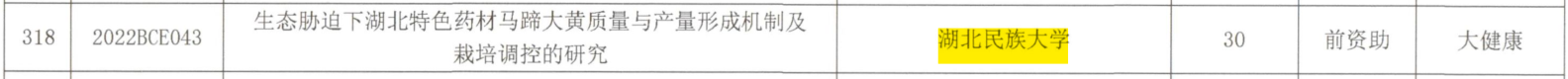 本网讯 (通讯员 刘昕) 近日,湖北省科技厅下达了2022年生科技计划项目(第三批)的通知,武陵山中药材检验检测中心技术负责人涂星主持的项目《生态胁迫下湖北特色药材马蹄大黄质量与产量形成机制及栽培调控的研究》获得湖北省重点研发计划项目(大健康领域支持地方专项)立项。