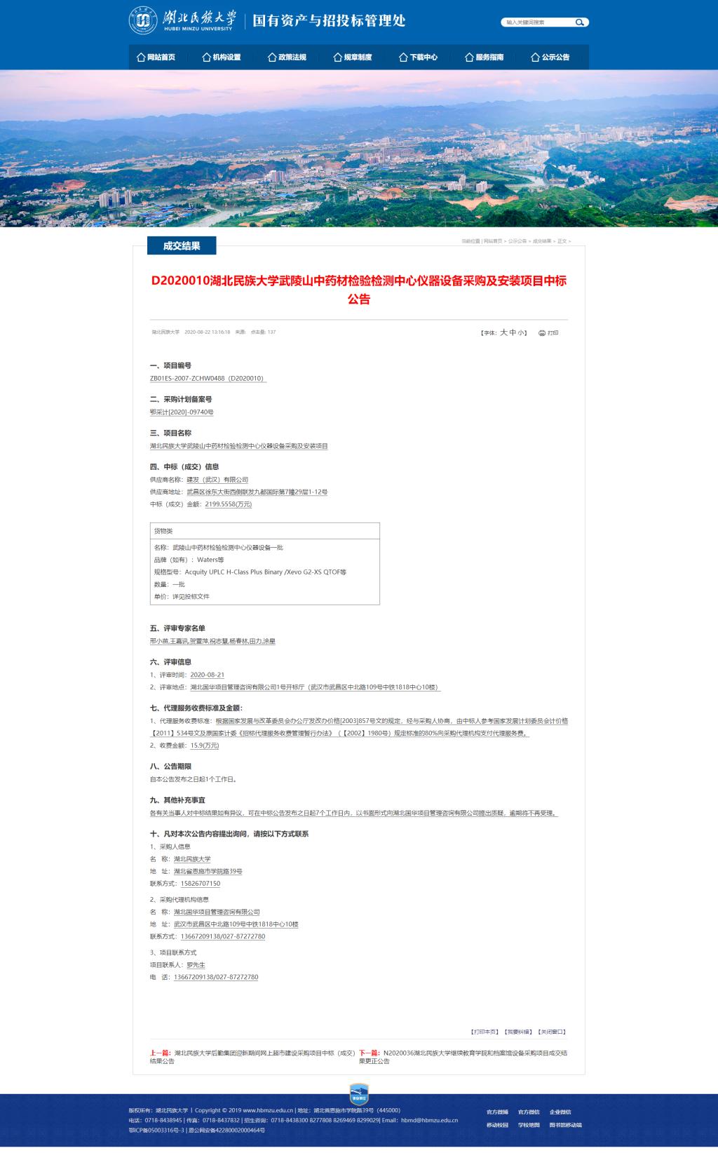 3044am永利集团3044noc武陵山中药材检验检测中心仪器设备采购及安装项目中标公告