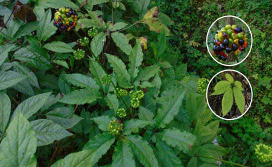 【植物形态】多年生草本,高约60cm。根茎发达,横卧,节结膨大,节密集,节间短,每节有一浅环形深陷的茎痕,呈竹鞭状。根肉质,呈圆锥形,常有数个生于根茎的侧面。茎直立,圆柱形,具纵纹。掌状复叶3~5片,轮生于茎端;叶柄细,长4~9cm;小叶3~7片,通常5片,小叶柄极短,中央小叶片较大,两侧小叶片自叶轮外侧向内逐渐变小,形成对称性的鸟足状复叶;小叶倒卵形至倒卵状椭圆形,长2~15cm,宽1~5.5cm,先端长而渐尖,基部楔形或圆形,边缘有细锯齿或重锯齿,无毛或叶脉上疏生刚毛。伞形花序单一,顶生,或有少数分枝;花小,多数,有小花梗;花萼5,齿状;花瓣5,卵状三角形,淡黄绿色;子房下位,二室,花柱2。核果浆果状,圆球形,熟时红色,顶端常为黑色。种子2~3粒。花期5~6月,果期7~8月。