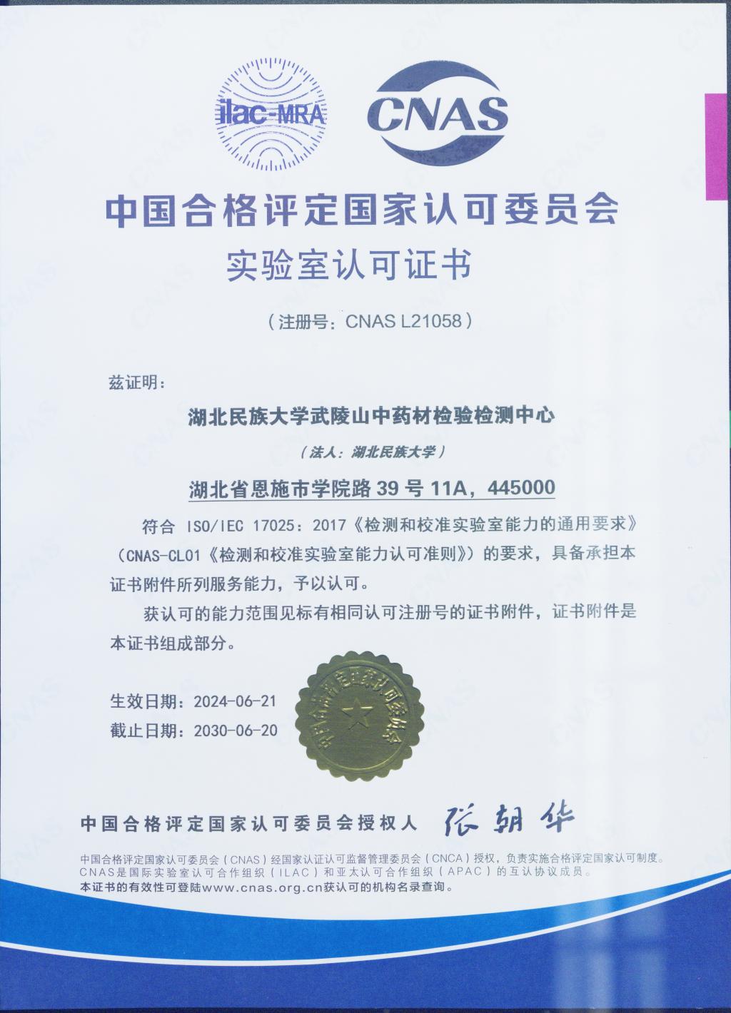 中心位于湖北省恩施市学院路39号(3044am永利集团3044noc校内11号教学楼A区),兼负中药材检验检测和中药材科研两大职能,总建筑面积近8000平方米,其中检验检测场地面积近3000平方米。中心于2021年10月获得检验检测机构资质认定证书(CMA),于2024年6月获得中国合格评定国家认可委员会认可证书(CNAS)。中心作为第三方检验检测机构,内设办公室、质量管理部、质量检测部和技术部,拥有先进仪器设备660余台(套),价值3000余万元,具备2020年版药典一部616种中药材产品、40项参数检测能力。