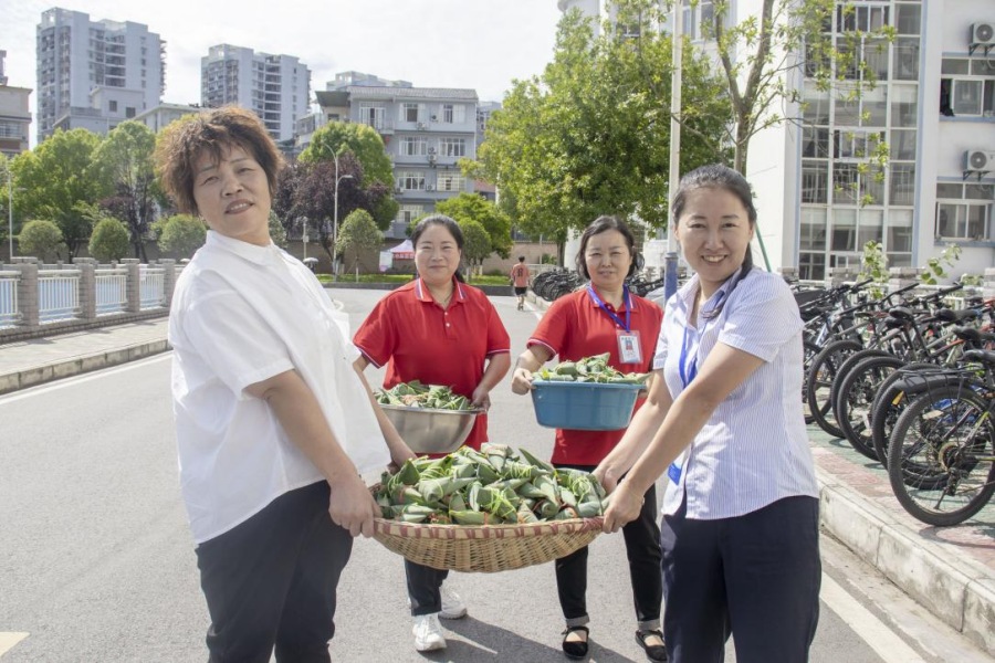 工作人员将包好的粽子送至食堂窗口蒸煮