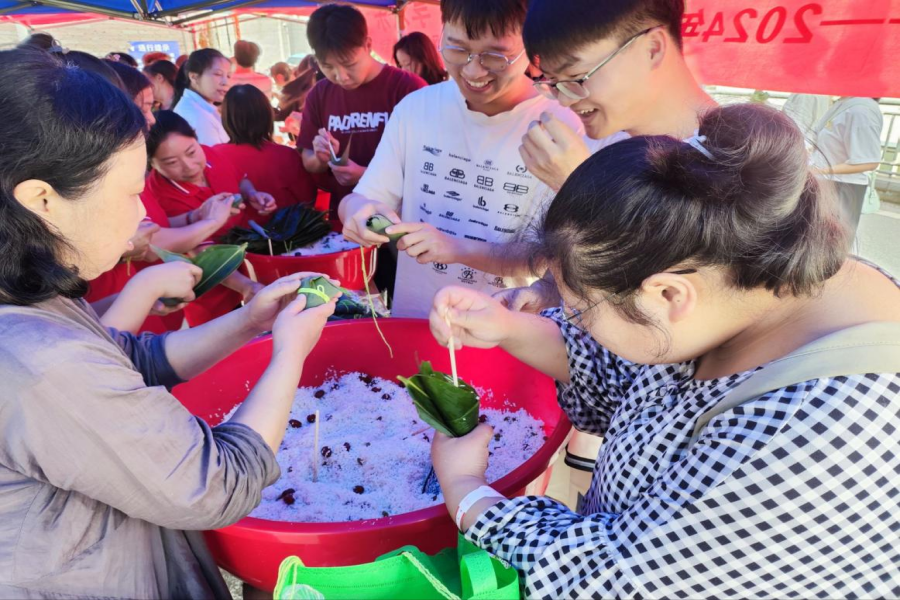 活动现场,工作人员准备了充足的糯米、粽叶、葡萄干、红枣等材料,师生们可自行选择DIY手工包粽子、制作“书法”粽子以及制作五色绳等小游戏参与本次活动,工作人员全程指导。学生社区的宿管阿姨指导现场参与者制作粽子,“两片粽叶要贴住,小叶子放里面,光滑的叶面朝上窝起来,要包紧点……”在场师生边看边学,捋粽叶、填糯米、封口、捆线,三角形、长条形等各式各样的粽子在手中诞生,现场气氛热烈。