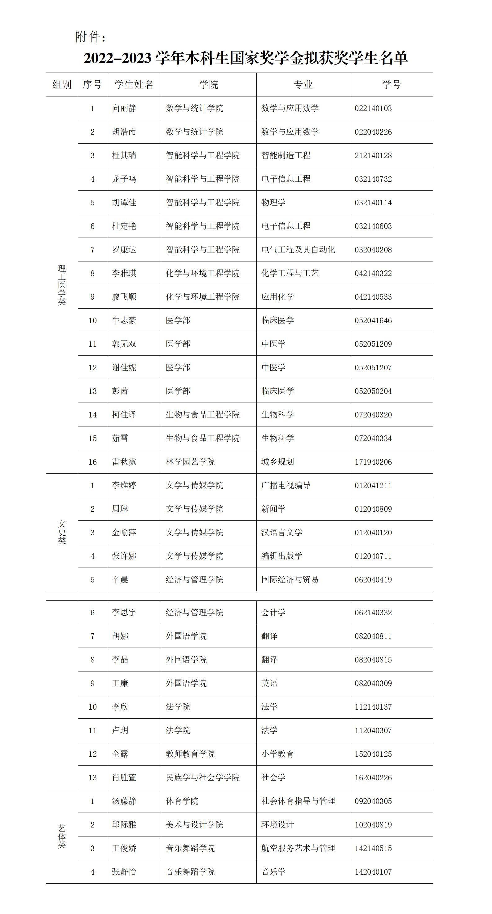 根据《湖北省学生资助管理中心关于做好2022-2023学年本专科生国家奖学金初评工作的通知》、《3044am永利集团3044noc本科学生国家奖学金实施细则》(民大校办发〔2020〕67号)、《3044am永利集团3044noc关于开展2022-2023学年国家奖学金评审暨国家奖学金答辩评审会的通知》等文件精神,经各学院(部)初评推荐、学生工作处组织答辩评审,拟确定柯佳译等33名学生为永利官网2022-2023学年本科生国家奖学金获得者,现公示如下,名单附后。