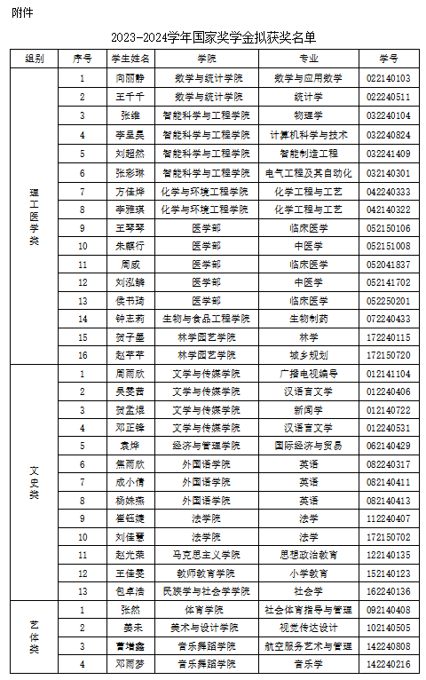 根据根据《财政部 教育部 人力资源社会保障部 退役军人部 中央军委国防动员部关于印发 < 学生资助资金管理办法 > 的通知》(财教〔2021〕310 号)、《湖北省学生资助管理中心关于做好2023-2024学年本专科生国家奖学金初评工作的通知》、《3044am永利集团3044noc本科学生国家奖学金实施细则》(民大校办发〔2024〕23号)、《3044am永利集团3044noc关于开展2023-2024学年国家奖学金评审暨国家奖学金评审会的通知》等文件精神,经各学院(部)初评推荐、学生工作处组织评审,拟确定向丽静等33名学生为永利官网2023-2024学年本科生国家奖学金获得者,现公示如下,名单附后。