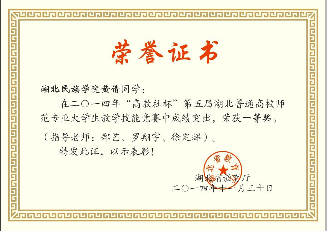 文学与传媒学院学生黄倩在2014年“高教社杯”第五届湖北普通高校师范专业大学生教学技能竞赛中成绩突出,获得一等奖。