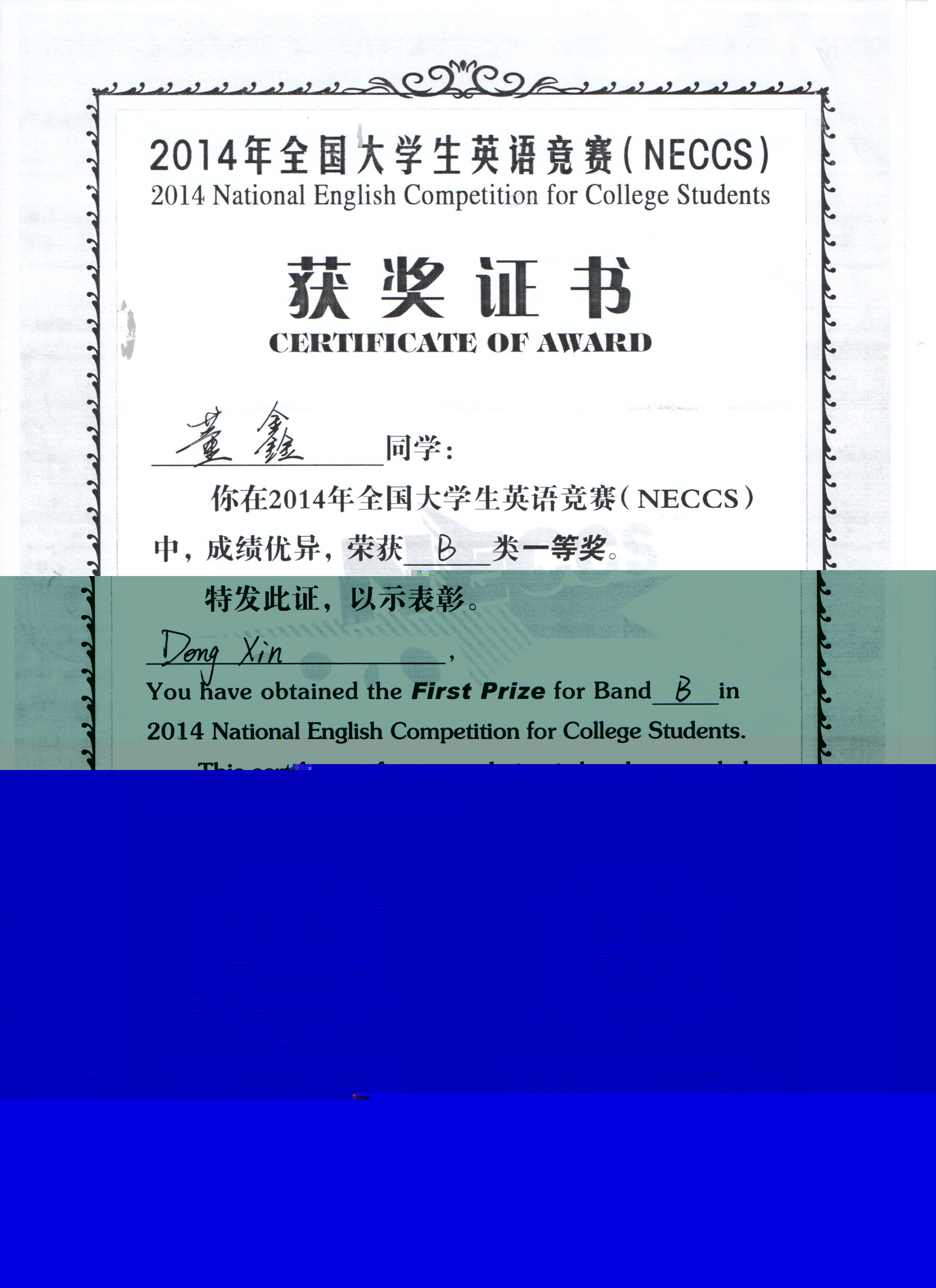 外国语学院学生在全国大学生英语竞赛中获得B组一等奖。
