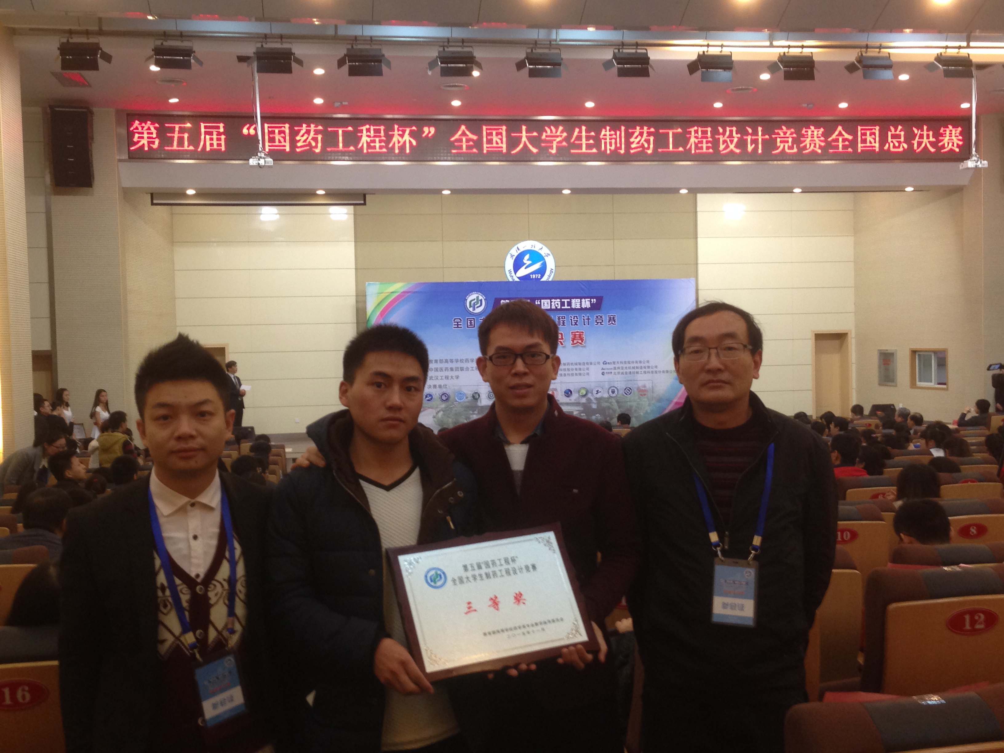 2015年11月13日至15日,由教育部高等学校药学类专业教学指导委员会主办,中国国药集团联合工程有限公司协办、武汉工程大学承办的第五届“国药工程杯”全国大学生制药工程设计竞赛全国总决赛在武汉工程大学举行。 化学与环境工程学院教师郑寅博士等指导的“民院队”(由张文、魏大鹏等6名同学组成)参与角逐,最终我院学生队员凭借扎实的理论知识和较强的实践创新能力,获得全国三等奖的好成绩。