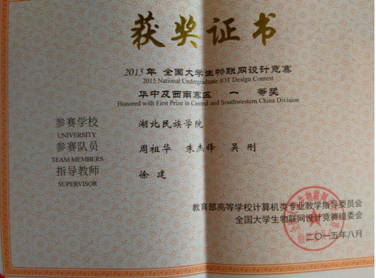信息工程学院学生在2015年全国大学生物联网设计竞赛华中及西南赛区中获一等奖。