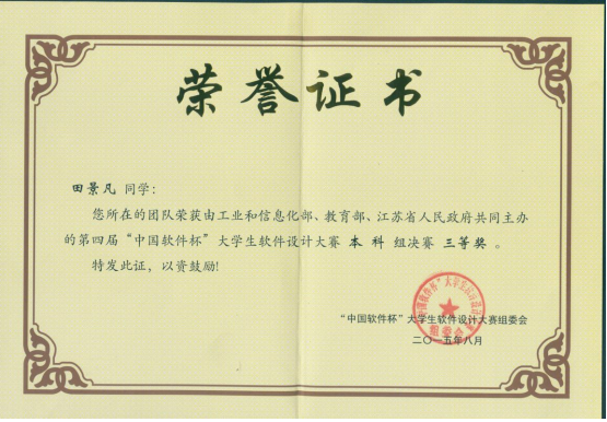 “中国软件杯”大学生软件设计大赛的前身为江苏省2009年发起举办的“江苏软件杯”大学生软件设计大赛,是一项面向高校在校学生的公益性赛事。在以往办赛经验的基础上,经进一步完善和提高,2011年升级为由工业和信息化部、教育部和江苏省人民政府联合主办的全国赛事。