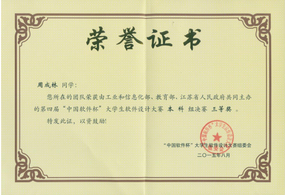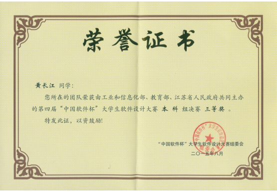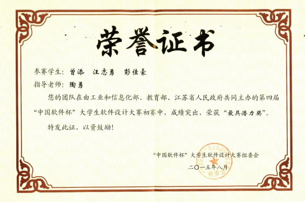 在2012年信息工程学院计算机科学与技术专业部分学生参加第一届中国“软件杯”大赛,2013年组织参加了第二届中国软件杯,并获得了全国二等奖的成绩。在总结前两届比赛结果的基础上,通过总结上次比赛经验的不足,认真做好各项赛前工作,并于2015年4月份组织部分指导教师及学生参加了第四届中国“软件杯”大学生软件设计大赛。本次比赛信息技术创新中心经过两个多月的认真准备、选拔、培训及指导,最终在6月30日前成功提交5件作品。经过参赛师生的共同努力,在总结上次比赛失败教训的基础上,在全国500多所高等院校2000多件件参赛作品当中,永利官网最终有1件作品成功入围现场决赛。8月17-20日在南京航空航天大学举行的第四届中国“软件杯”大赛现场决赛中,经过现场展示、综合评审与答辩评审三个环节,永利官网参赛选手杜周成林、田景凡、黄长江等3名同学的作品“比特能机器人”得到了全场评委专家的一致好评,最终荣获了全国三等奖。其他三支参赛队的作品在现场表现也不错,获得了“优胜奖”等奖项。