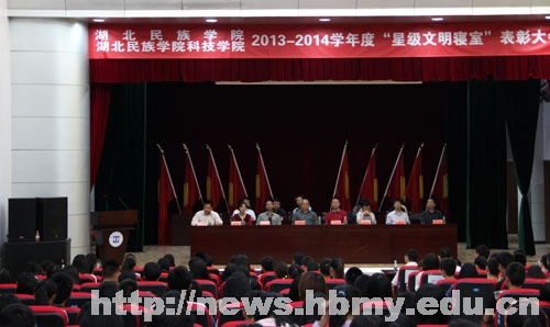 曾祥华处长宣读了《湖北民族学院、湖北民族科技学院2013——2014学年度“星级文明寝室”创建活动表彰文件》,大会表彰了K2606、K11606、24817三个“红旗寝室”,1110等30个“五星级文明寝室”,7—622、4—707等90个“四星级文明寝室”,K2—710等200个“三星级文明寝室”。同时,授予陈朦等30名学生“标兵寝室长”荣誉称号,杜苗等90名学生“模范寝室长”荣誉称号,陈祺等200名学生“优秀寝室长”荣誉称号;24栋,K2,K3、K11分别表彰为“五星级文明楼栋”、“四星级文明楼栋”、“三星级文明楼栋”。文学与传媒学院、医学院等7个单位在本次星级文明寝室创建系列活动中获“优秀组织单位”称号。大会中,星级文明寝室长代表谭艳玲发表获奖感言。最后,李建华老师指出,星级文明寝室创建活动的目的在于增进室友间的感情,构建和谐温馨的寝室坏境。
