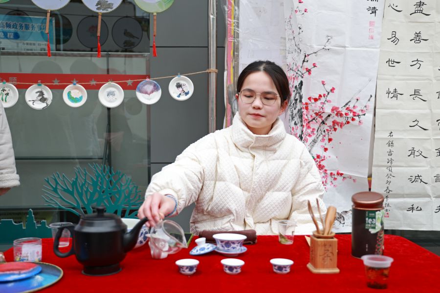 茶艺公益表演活动中,表演者摆放好各种茶具,演示了一场完整的茶叶泡饮过程。端庄优雅的姿态和娴熟流畅的泡茶技艺,为观众带来一场视觉、嗅觉与味觉的惊喜体验。现场还设置了与茶艺和雷锋相关的小游戏以及知识问答,答对者即可获得茶包或雷锋日纪念小礼品。“茶艺表演的各个环节都很重要,这次表演不仅带来了美妙视觉感受,也让我学习到了更多茶文化。”文学与传媒学院秦智帮如是说。