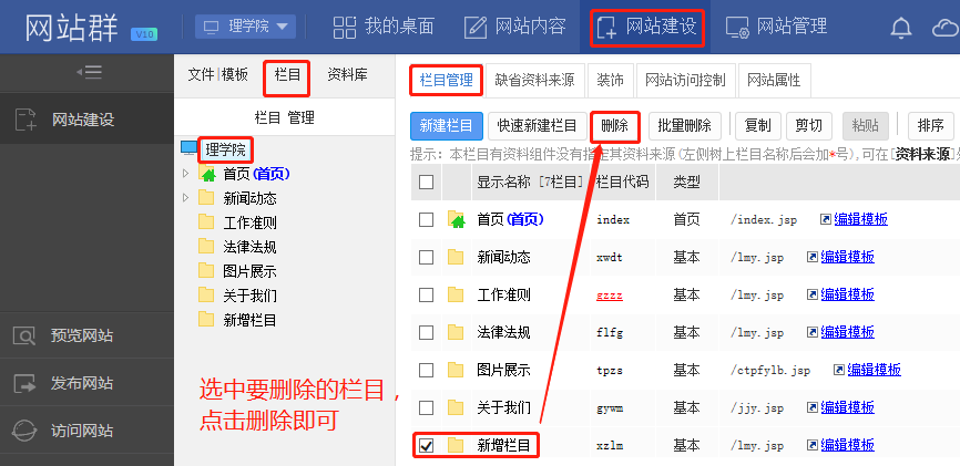 【网站群管理系统】删除或修改栏目