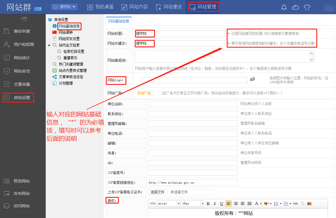 网站基础信息处,对网站进行基础信息的修改,如下图所示: