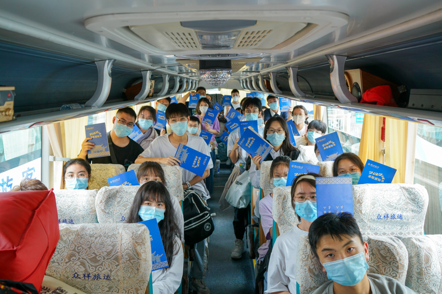 新生在迎新大巴车厢内合影