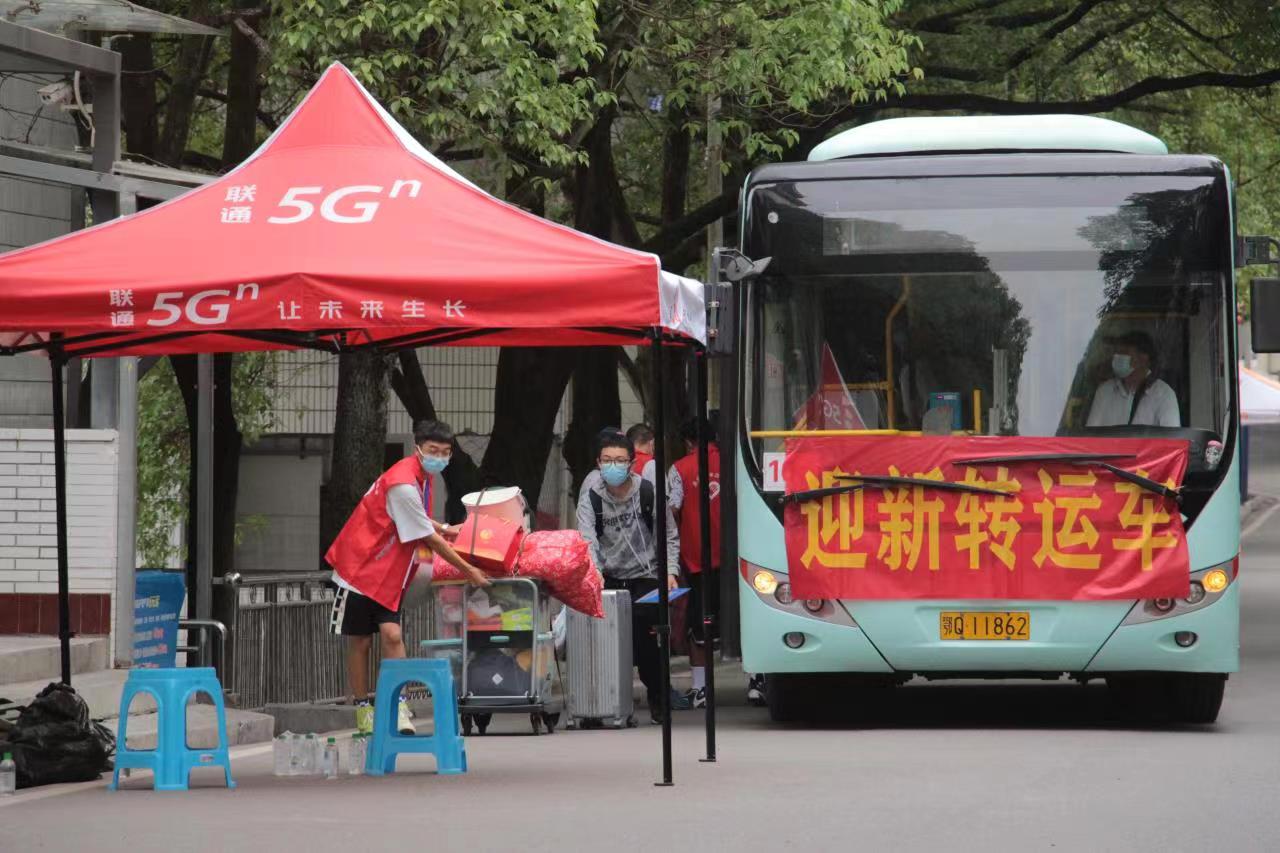 新生在红马甲志愿者引导下有序乘车