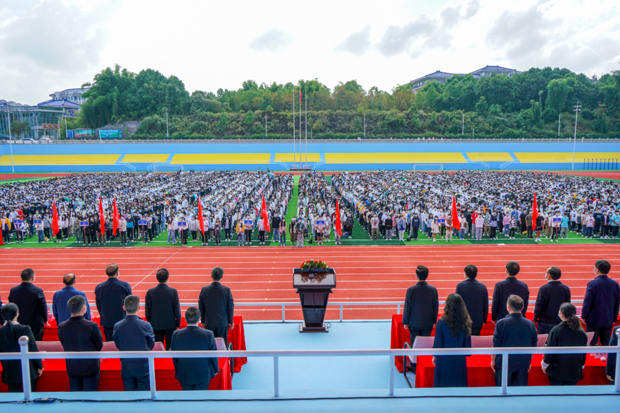 开学典礼在庄严的国歌声中拉开帷幕。全体师生目视五星红旗冉冉升起,在蓝天白云的背景下高高飘扬。