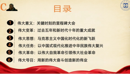 会议上,向鑫老师围绕党的二十大的伟大意义、伟大变革、伟大思想、伟大任务、伟大革命、伟大号召六个方面为同学们展开了讲解。其中,伟大意义和伟大变革是对党的过去历史的回顾,伟大思想是指导党前进的理论指南,伟大革命是不断进步的路径,而伟大任务和伟大号召是对未来的展望。伟大任务明确指出,要以中国式现代化推进中华民族的伟大复兴,向鑫老师通过新时代十年以来的GDP变化对比,立足于恩施,结合二十大提出的尊重自然、顺应自然、保护自然,提出了在新时代新征程上的恩施路径、恩施担当、恩施作为、恩施模式和恩施答卷。