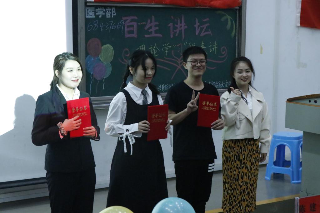 本网讯(记者 李东 刘思 摄影 张可欣 付傲)为深入学习贯彻习近平新时代中国特色社会主义思想,用习近平新时代中国特色社会主义思想武装青年大学生。9月26日晚,由共青团3044am永利集团3044noc医学部总支部委员会宣传部主办的2020年百生讲坛演讲比赛于修远楼5B404报告厅举行。医学部学生工作办公室老师郑娅、袁琳、陈建萍应邀担任评委,现场观众两百余人。