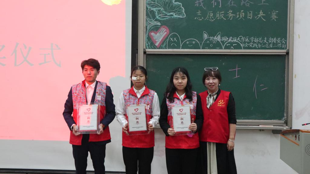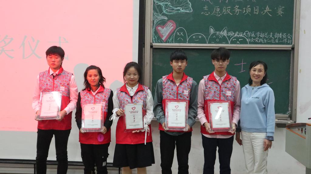 (本网讯 通讯员 袁子涵 许旖蕾/文 摄影 李湘 李东 曾凡轩/摄)为进一步弘扬志愿服务精神,宣传志愿服务理念,引导大学生在服务社会的实践中受教育、长才干、做贡献,5月28日,医学部在修远楼5B404教室联合开展第一届志愿服务项目大赛。此次活动由医学部团总支社会实践与志愿者工作部及医学部青年志愿者协会主办。恩施义工协会发起人向波,副会长汪娜,恩施州残友之声志愿帮扶协会会长严明君,医学部党委书记黄晓波,音乐舞蹈学院团总支书记单家迪,医学部学生工作办公室老师袁琳、陈建萍应邀出席并担任评委。现场观众200余人。