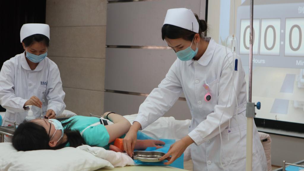 活动在特邀嘉宾王鑫同学的《等风雨经过》中拉开序幕。经过前期评选,共有12人入围决赛。本次决赛共有参赛选手分组护理知识演示和基本护士礼仪展示两个环节。护理知识演示将由选手们通过模拟演练向评委们展示急救的项目,操作方法等内容。在演练过程中,一号,二号选手展演的心肺复苏急救术让现场观众真切感受到急救现场的紧张和争分夺秒,真正让观众感受到了“时间就是生命”。生命体征是标志生命活动存在与质量的征象,是评估身体的重要项目之一,五号、六号、七号选手向大家展示了生命体征检测技术标准以及其对于诊断的重要性,获得观众的一致好评。在护士基本礼仪展示中,参赛选手分别向大家展示了整理仪容、鞠躬、蹲姿、拾物资、病历夹等基本护理工作和礼仪。在全体选手和护理专业学生共同宣誓时,更让大家感受到了护理专业的庄严。最终五号选手耿祥莲在测量患者基本生命体征护理演示和护士礼仪展示中凭借优异表现获得93.27的最高分,荣获本次比赛一等奖