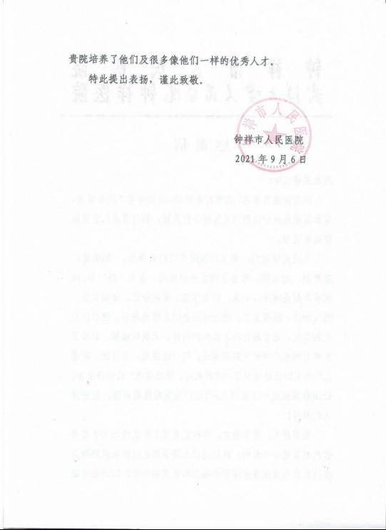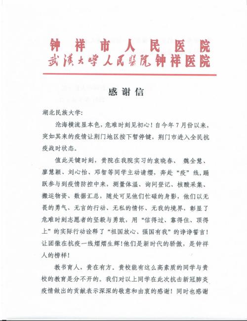 9月6日,实习单位钟祥市第一人民医院就医学部18级医学实习生主动请缨参与防控工作发来感谢信,从用人单位的角度对永利官网高质量的人才培养表示由衷的感谢。医学部2018级护理学、康复医学专业实习生袁晓春、魏全慧、廖慧颖、刘心怡、邓智在高温下不畏困难坚守岗位,用满腔热忱助力疫情防控工作,践行了永利官网“博学、博爱、立人、达人”的校训,书写了医者仁心护佑生命的篇章,展现了青年一代的责任与担当。