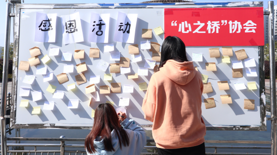 活动设有“为你送上一杯热水”的实践活动和留言活动两个环节。实践活动环节在茶盏氤氲升腾的雾气中拉开帷幕,在寒冬腊月里披星戴月的学校工作人员得以稍作休憩,在社团成员的陪伴下,轻抿一口沁人心脾的茶水慰藉劳累的身体。在留言活动环节中,由参与学生在颂恩板上贴上自己内心的悄悄话:“先生之风,山高水长”“天地浩荡,师恩永存”……其中,还有许多来自西藏、新疆的少数民族同学也将少数民族的文字写在小小的便利贴上,将感恩与思念寄于远方的父母。一句句发自心扉的话语顺着氤氲的茶香溢满了整个校园,在每个人的耳畔,轻吟一首感恩的歌。