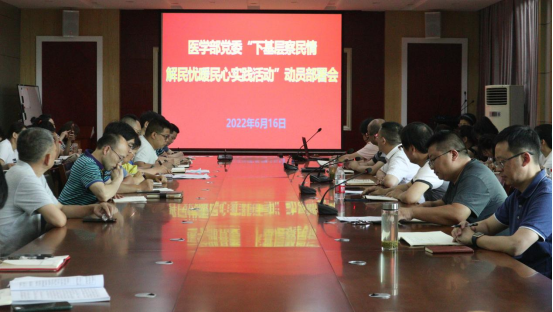 本网讯(通讯员 陈秋妙 扶万里/文 黄太斌/摄)为引导党员干部深入基层、深入群众,着力在基层第一线发现问题,及时疏导,化解矛盾。6月16日,医学部党员干部“下基层、察民情、解民忧、暖民心”实践活动动员部署会在医学部7号会议室召开。医学部党委常务副书记、副主任廖云主持会议,3044am永利集团3044noc副校长、医学部党委书记、主任祝建波,医学部全体中共党员参与本次会议。