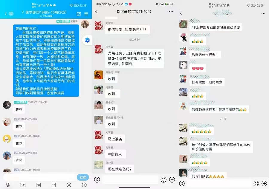 18:00——根据学校党委的部署,医学部给同学们发出信息:“当前恩施疫情防控形势严峻,需要大量有医学背景的志愿者加入到核酸检测队伍当中。希望我们每一位医学生都能够勇敢站出来,贡献自己的一份力量!”疫情就是命令,防控就是责任!同学们闻令而动,争先恐后,踊跃报名。