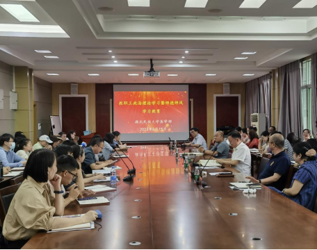 首先,罗洪斌主任向教师们剖析了教育部公开曝光第十二批7起违反教师职业行为十项准则的典型案例,用反面典型案例对全体教职工进行了一次深刻的警示教育。随后,他向大家分享《科技部办公厅关于开展学术不端自查和挂名现象清理工作的通知》,并说明了各地高校近期陆续发布了要彻底清理学术不端问题论文存量并着力遏制增量的通知,他借此提醒教师们对学术不端问题进行自查和无实质学术贡献挂名清理,并对全院教职工提出要求,要求教职工深刻认识新形势下师德师风建设的重要性和紧迫性,牢记立德树人根本任务,坚守职责与使命,以新时代“四有”好老师为标准,争做培养时代新人的“大先生”。