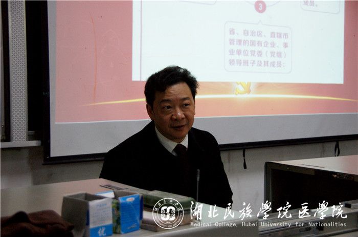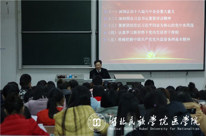 吴建清教授为党员发展对象和预备党员讲授了五个方面的内容,分别是:深刻认识十八届六中全会深刻意义、深刻领会习总书记重要讲话精神、紧密团结在以习近平同志为核心的党中央周围、认真学习新形势下党内生活的若干原则、准确把握《中国共产党党内监督条例》基本精神。他还结合自己在学习、工作、生活中的经验,阐述了自己对党员的理解。吴教授谈到,作为党员干部要吃苦在前、享受在后,甘于贫困、甘于奉献,要将入党誓词里所提到的工作原则内化于心,外化于行。随后他结合中国传统名著《西游记》中唐僧四人坚定不移取经的例子,勉励全体学员要加强政治学习、坚定理想信念、不断提高党性修养,自觉成为中国特色社会主义的可靠接班人。