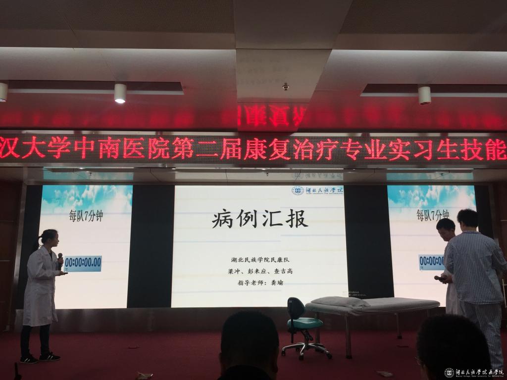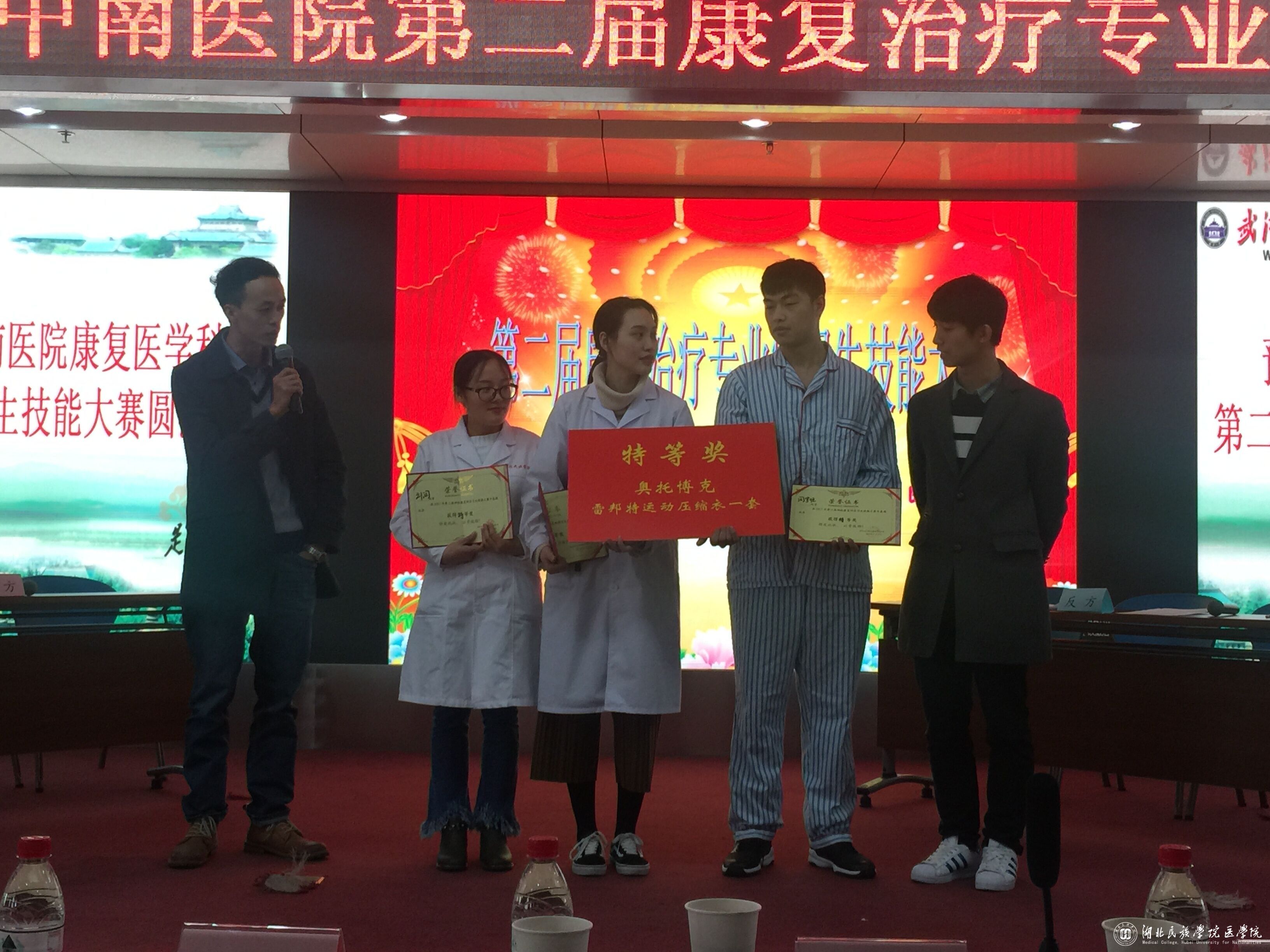 11月19日,江城武汉气温骤降,由武汉大学中南医院主办的“第二届康复治疗专业实习生技能大赛”在中南医院门诊部13楼1号会议室火热进行,共有由湖北民族学院、湖北职业技术学院、武汉大学医学职业技术学院等12所院校33名同学组建的11支队伍参赛进行了康复技能的大比武。湖北民族学院医学院有5名实习生分为两只队伍参加了比赛,分别囊获了特等奖和三等奖。