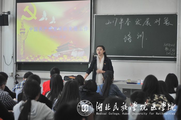 本网讯(通讯员 王蓉/文 肖智仁/摄)为提高党员发展对象对党组织的认识,使其明确今后的发展路线,5月4日,我院在8401教室举行了2017年春党员发展对象集中培训动员大会。我院党委副书记张蕊应邀担任主讲人,共51名党员发展对象参加了此次活动,大会由学生科老师郑娅主持。