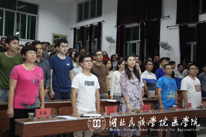本网讯(通讯员 郭曼 杨柯/文 熊慧雯/摄) 6月18日,我院在8402教室举办“践行爱国主义争做优秀大学生——医学院新疆少数民族学生成长汇报会”,我院党委副书记张蕊,学生科副科长张辉,民族事务工作处吕波,阿布都卡迪尔·买合木提,阿巴斯·图尔兹老师出席本次活动。伊尔夏提·吐逊江,海仁古丽·艾尔肯,库勒恰什·巴特尔,胡西塔尔江·艾山江,依丁·卡麻五位新疆籍优秀毕业生应邀与医学院新疆籍同学们分享考研及就业经历。本次活动由梁丹玉老师主持,约140人参加本次活动。