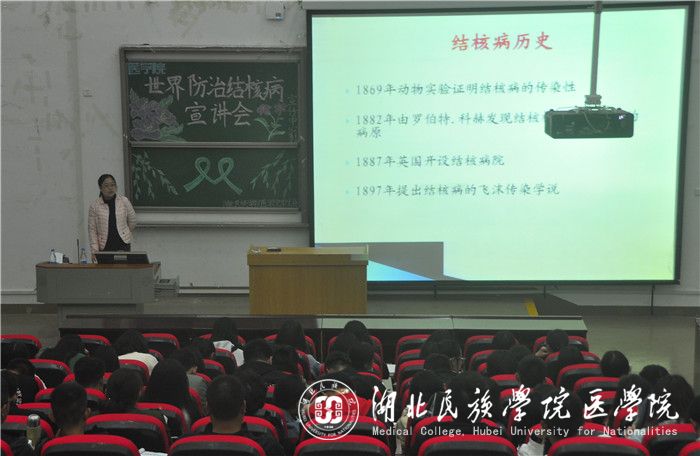 本网讯(通讯员 向锦月 田炎红/文 吕丰旭/摄 )近日,我州发现多起结核病例,为加强大学生对结核病的认识,进一步做好预防措施,3月22日晚,医学院学生会于修远楼5B403教室成功召开“世界防治结核病”宣讲会,我州疾病控制中心别玉萍老师应邀担任主讲人。